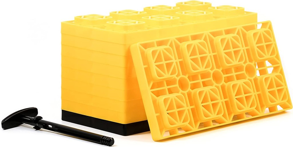 These blocks stack together and lock with a carry handle for easy transport. They are wide enough for tandem axle trailers and hold up well under the weight without breaking. They can also lock together to form ramps and don’t slide while trying to drive over them. Pack of 10.